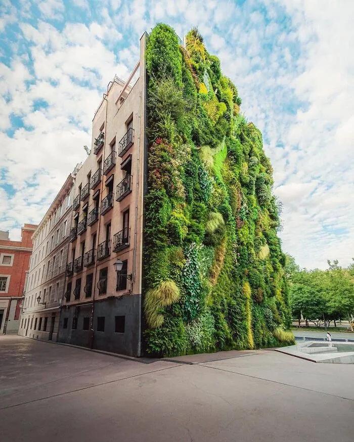 位于西班牙馬德里的垂直花園,位于馬德里當代藝術博物館Caixa Forum之前,是目前世界上種植最好的垂直綠化景觀。它是帕特里克·布蘭克(Patrick Blanc )在2008年建造完成的。四層樓高的綠墻與相鄰建筑物的深橙色鐵銹形成鮮明的對比,植物茂盛的垂直花園吸引了游客坐在周圍休息,以躲避馬德里灼熱的太陽。
